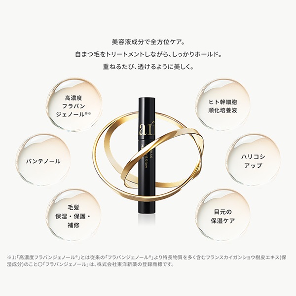 肌と毛髪の健やかな働きをサポートする独自成分・高濃度フラバンジェノール®※2をはじめ、「ハリ・コシアップ」「毛髪保湿」「毛髪補修」「毛髪保護」「目元の保湿ケア」の6方向から、メイクタイム中ずっとまつ毛をケアします。